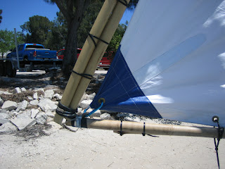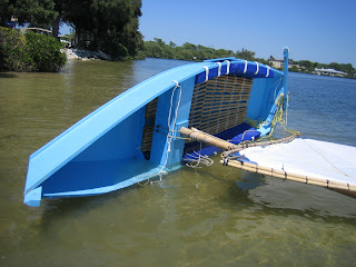 So lets test it. Here's a view of the boat floating on it's side in about 2 feet of water. The boat is floating relatively high in the water due to the cushions. No part of the boat, sail, or mast is touching the bottom. The boat, when righted from this floating high position contains some water but is manageable.