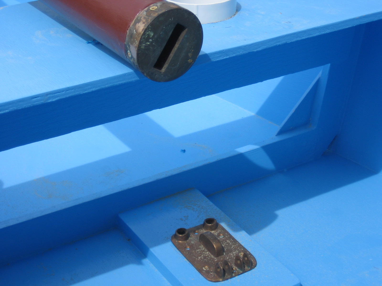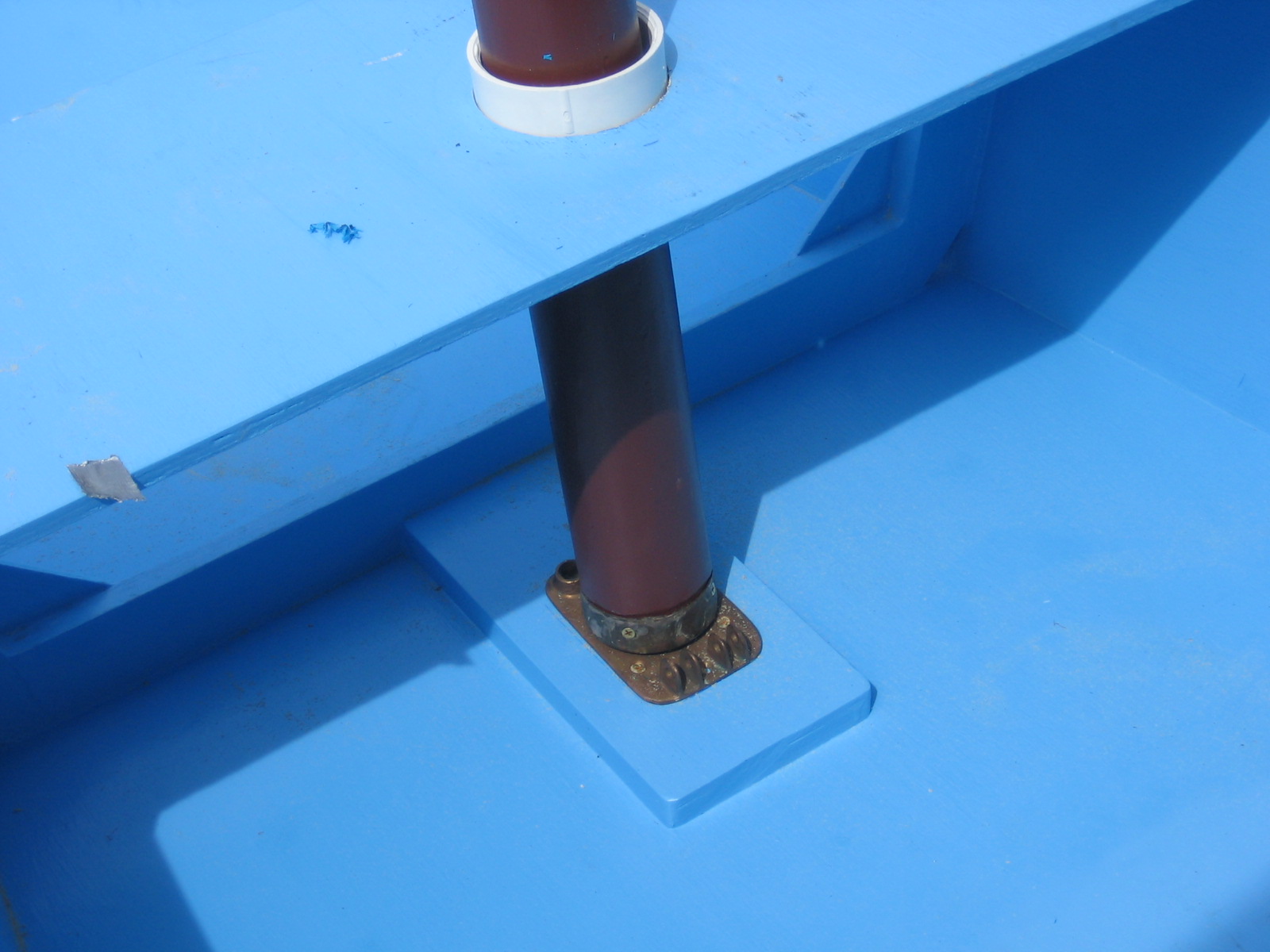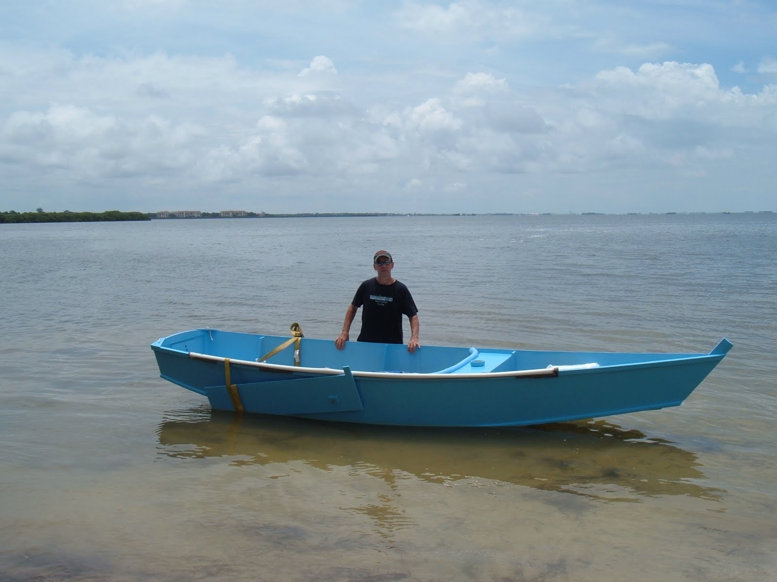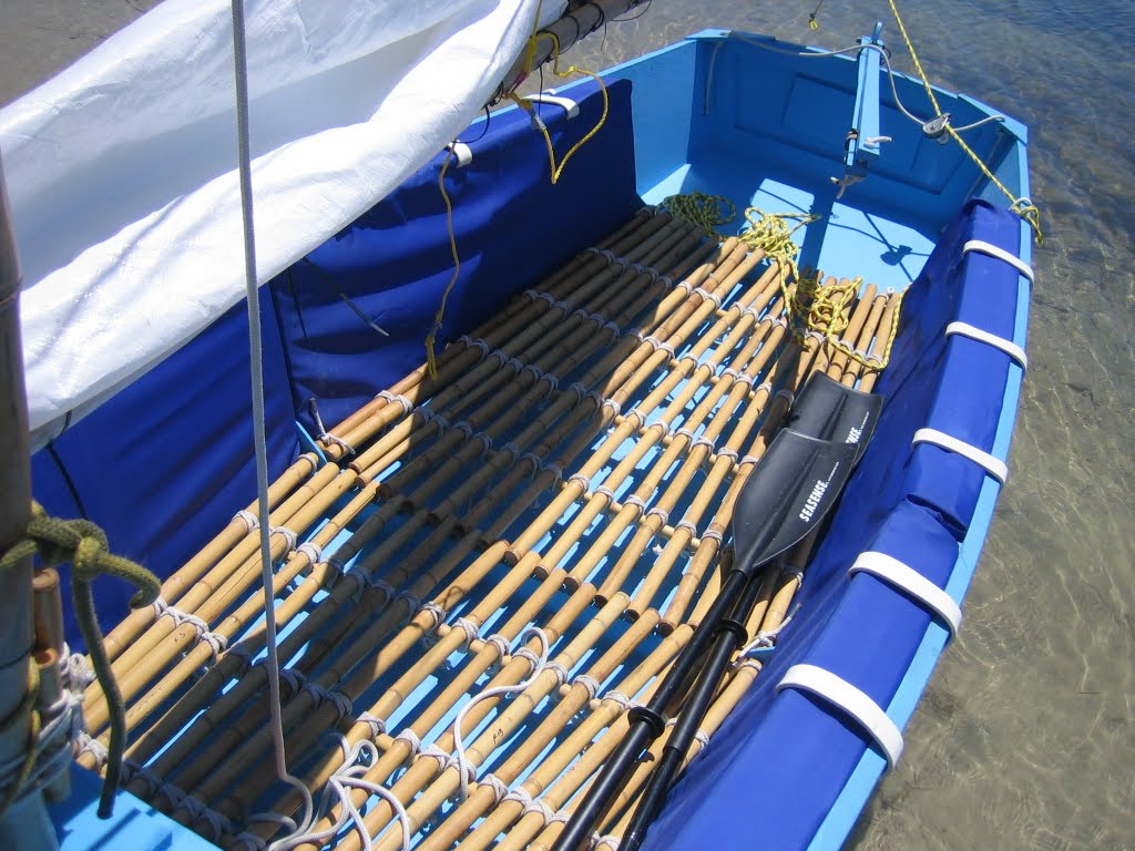 View of the interior. The blue cushions on either side of the boat are of nylon rip stop material covering 4 inch wide styrofoam. If I was crossing the ocean I'd probably provide different floatation but for a beach toy I think this is fine, relatively easy, and cheap.